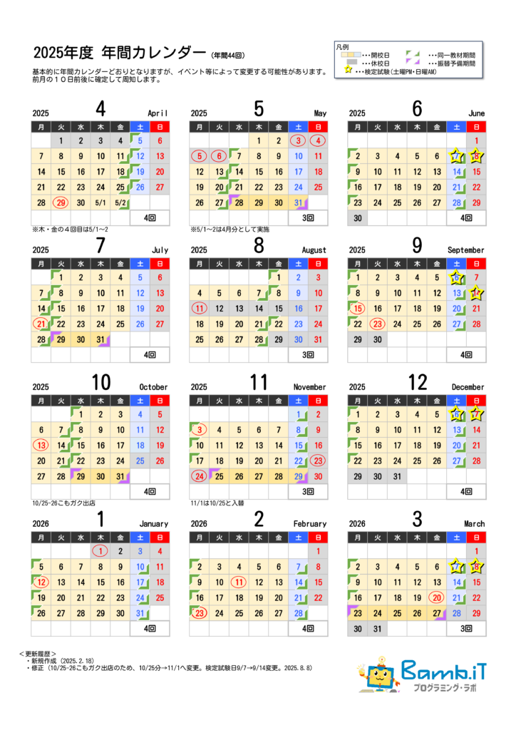 基本的に年間スケジュールどおりとなりますが、イベント等によっては変更する可能性があります。変更する場合においても前月10日前後に確定します。