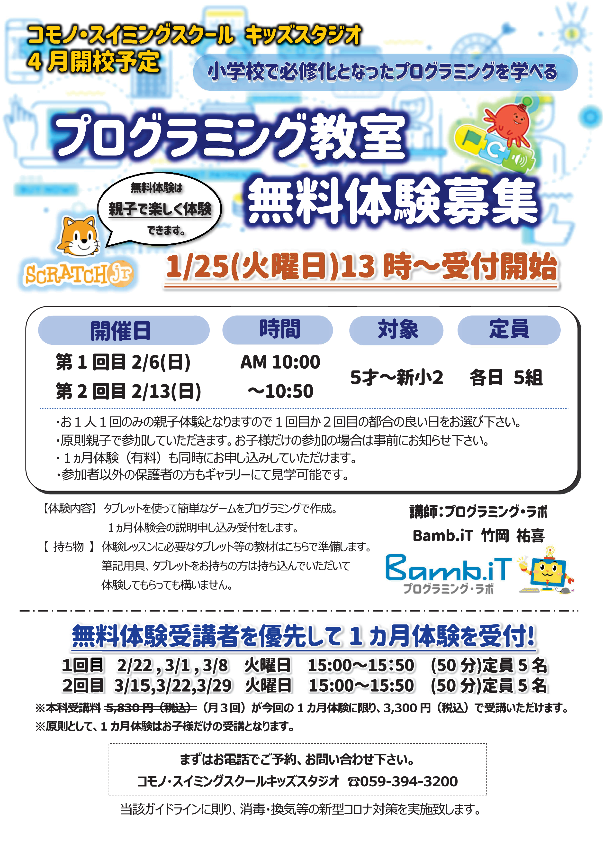 2022年4月より、コモノスイミングスクール キッズスタジオにて「キッズプログラミング教室」を開校します。それに先立ち2~3月に体験教室を実施します。